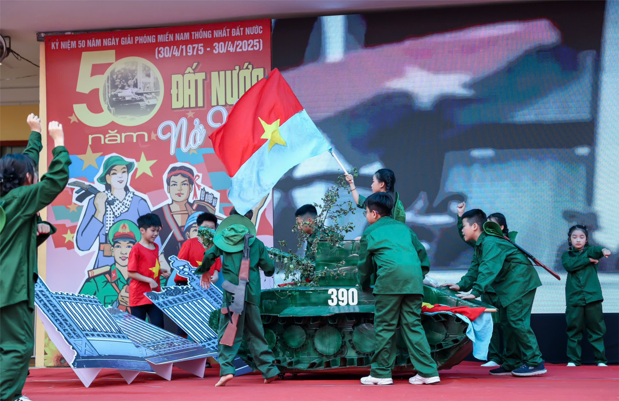 Chuyên đề “50 năm đất nước nở hoa- Tự hào quê hương em” gồm 2 phần. Mỗi phần được xây dựng công phu cùng khả năng trình diễn tự tin của các em học sinh trong nhà trường, kết hợp với phục trang, âm thanh, ánh sáng, âm nhạc, lời bình…đã thu hút sự theo dõi của các em HS.