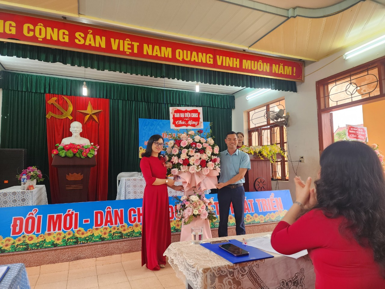 Đ/c Trần Thị Dinh – Bí thư chi bộ, Hiệu trưởng nhà trường tặng hoa chúc mừng các